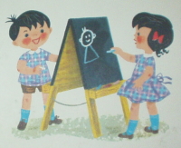Topsy and Tim were taking a new girl to school. They showed her where to hang up her coat and they looked in the big toy cupboard. The new girl started to cry as she wanted to go home. Topsy and Tim tried to cheer her up but she didn't stop crying until they went on the slide. Then they had drinks in the wendy house and played at having tea.  Afterwards they did some painting. Soon their Mummies came so they washed their hands and went to fetch their paintings. The new girls' painting wasn't there it had blown into a bush outside in the wind. Tim found it for her and they all went home.